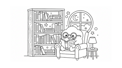 Clover in his little house reading one of the many books on his book shelf.